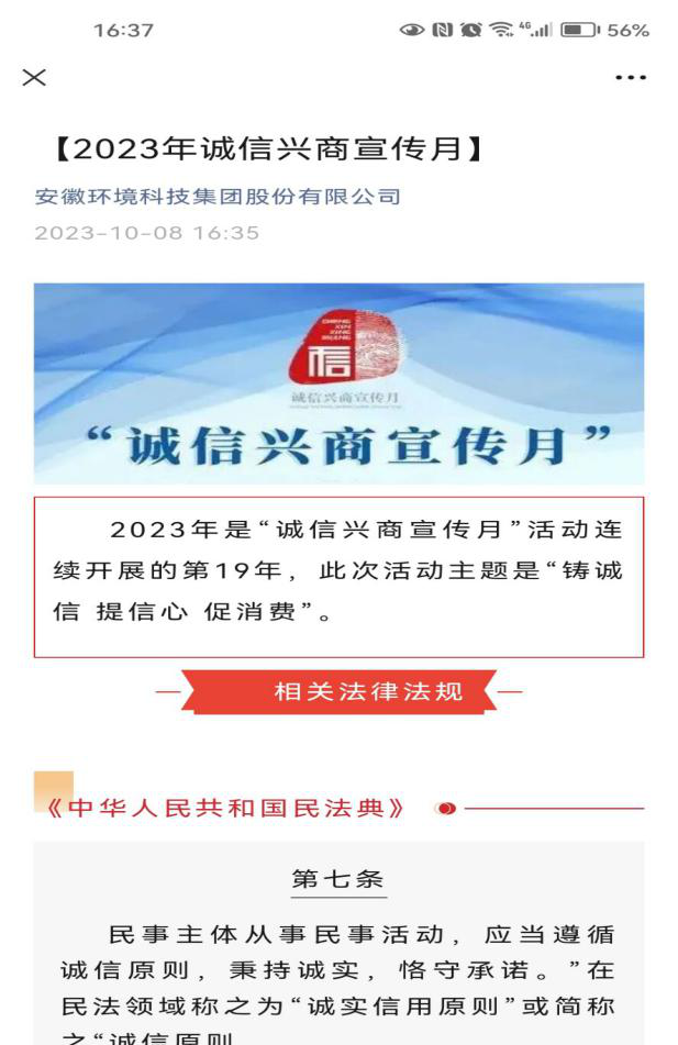 所屬環(huán)境集團(tuán)、地產(chǎn)集團(tuán)、酒店公司通過制作張貼誠信宣傳海報(bào),在公眾號發(fā)表誠信主題文章等形式,號召公司全體職員牢固樹立誠信意識。